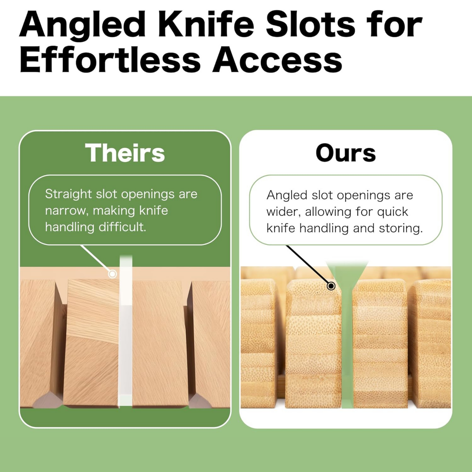- Durable & Sustainable Bamboo: Crafted from eco-friendly bamboo, this knife block offers long-lasting durability. Bamboo is a renewable resource, making it an environmentally responsible choice for your kitchen.