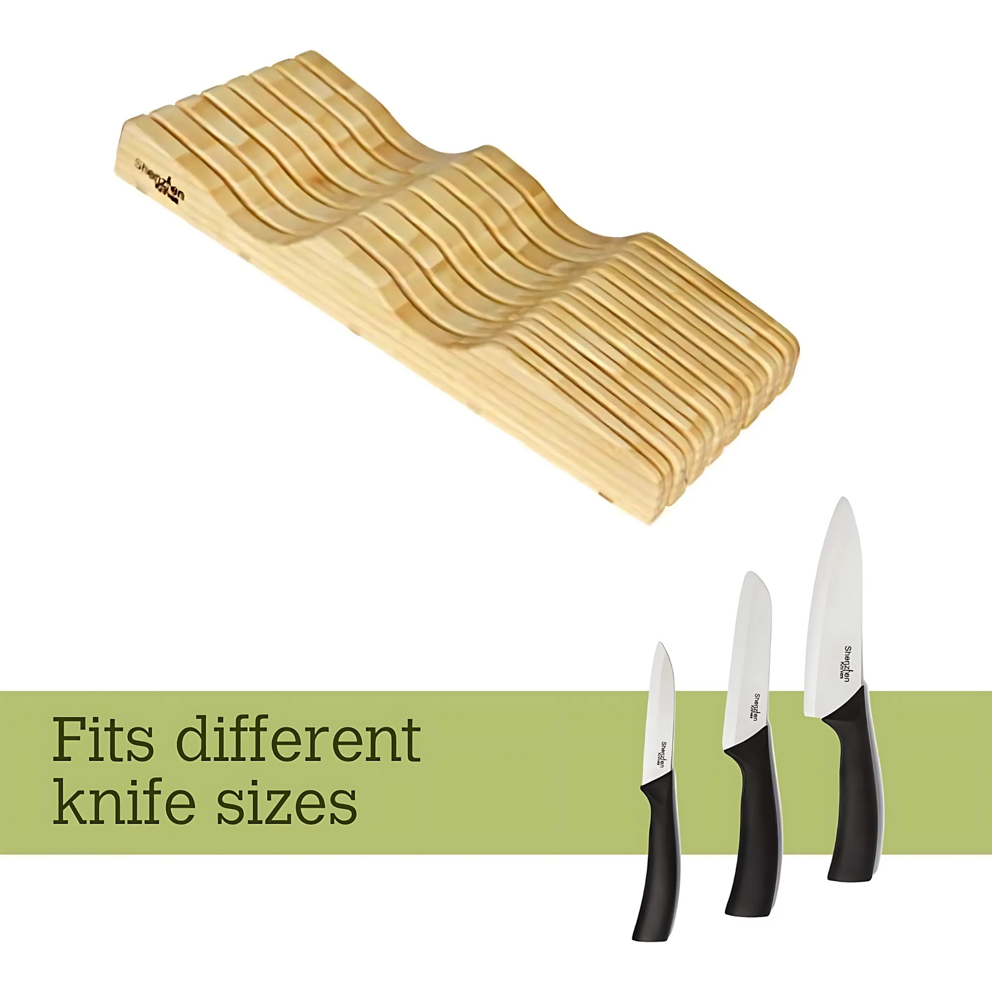 - Space-Saving Organization: Keep your kitchen counter clutter-free with this in-drawer knife block. Designed to fit most standard drawers, it provides a sleek and discreet storage solution while ensuring your knives remain easily accessible.