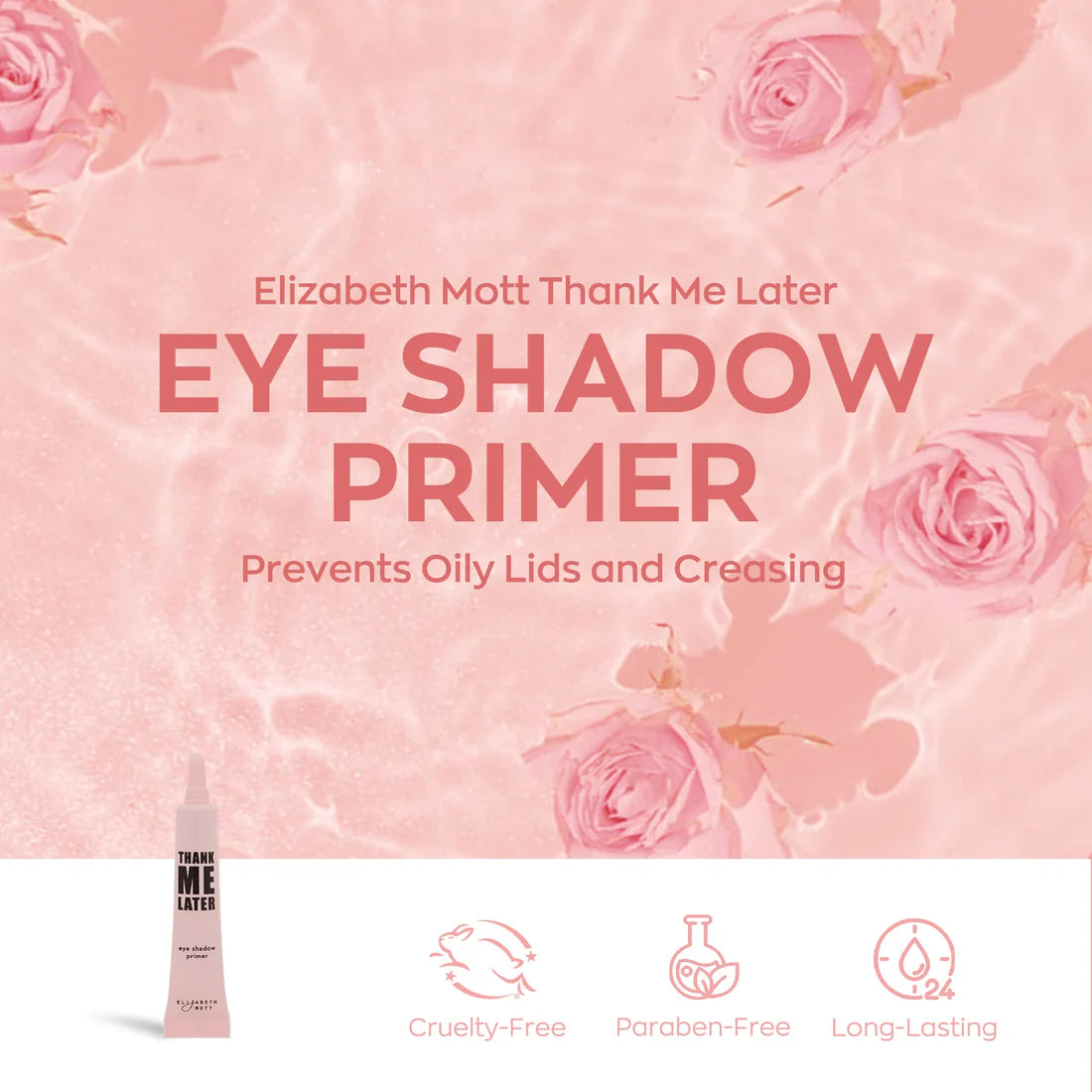 Introducing Elizabeth Mott's Thank Me Later Eye Primer – lets your eyeshadow shine its brightest! This cruelty-free formula not only enhances your eyeshadow but also locks in your look for all-day wear. Whether you're heading to a dinner date after work or squeezing in a quick workout, your eyeshadow stays perfectly in place. The lightweight, quick-drying formula preps your lids with a smooth, invisible finish, ensuring flawless application and long-lasting results from morning to night.